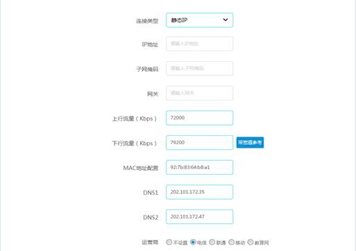 注释:DNS需要根据当地情况决定,非特殊情况建议使用当地运营商的DNS,不建议使用网关地址作为DNS使用
