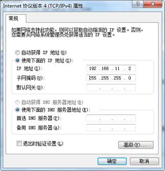 配置PC设置IP地址为 192.168.11.x(x为2-254,确保不和网络中其他IP冲突),如下图: